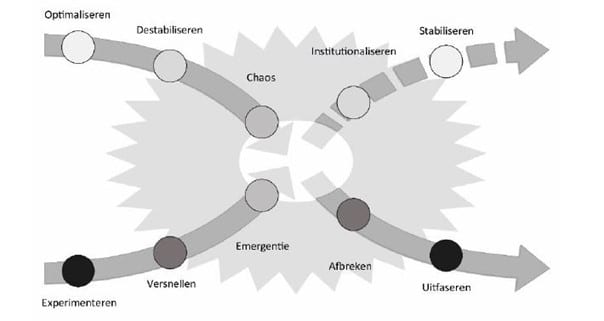 In het gehele sociaal-maatschappelijke systeem van onze samenleving vinden transities plaats volgens een bepaald patroon van opbouw-afbouw. Het oude, tot dan toe optimaal functionerend systeem destabiliseert, er ontstaat chaos, afbraak en uiteindelijk worden de elementen die behoren tot het systeem uitgefaseerd. Tegelijkertijd vinden experimenten plaats, die als het ware in een stroomversnelling komen, een systeem met nieuwe eigenschappen komt tot stand, waarna dit systeem meer vastigheid krijgt en uiteindelijk een nieuw stabiel systeem vormt.