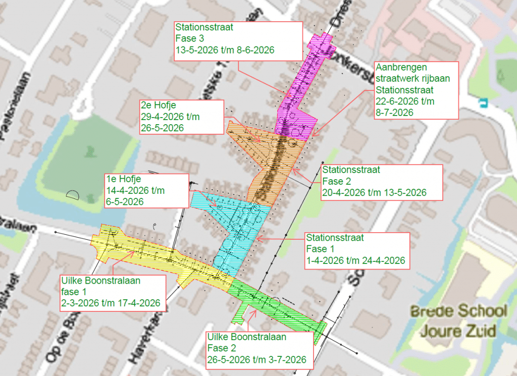 Vanaf 2 maart tot en met 3 juli zal er in de Stationstraat en de Uilke Boonstralaan in Joure rioleringswerkzaamehden worden uitgevoerd. De werkzaamheden worden in 5 fasen uitgevoerd.